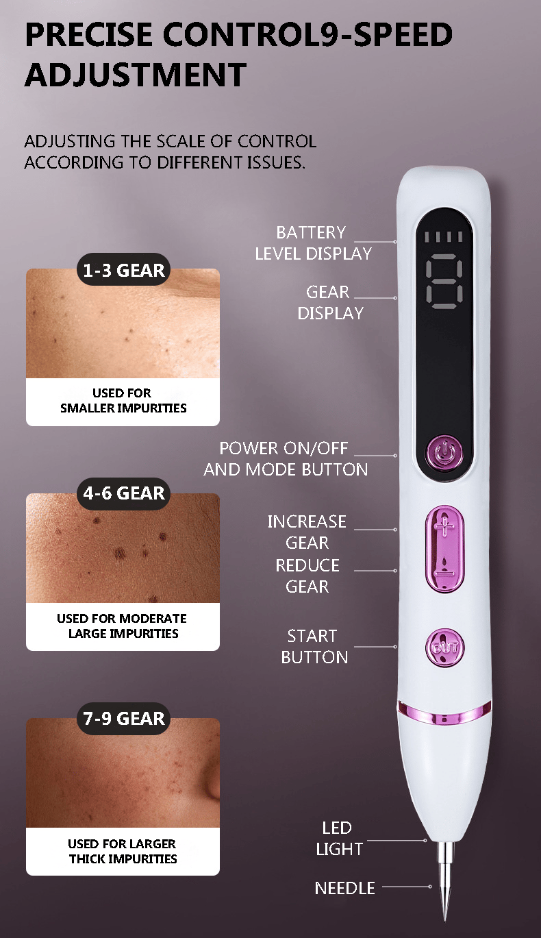 āļø Precision spot treatment: Blue light illumination + 9 adjustable levels tackle blackheads, dark spots, tattoos, and fine lines