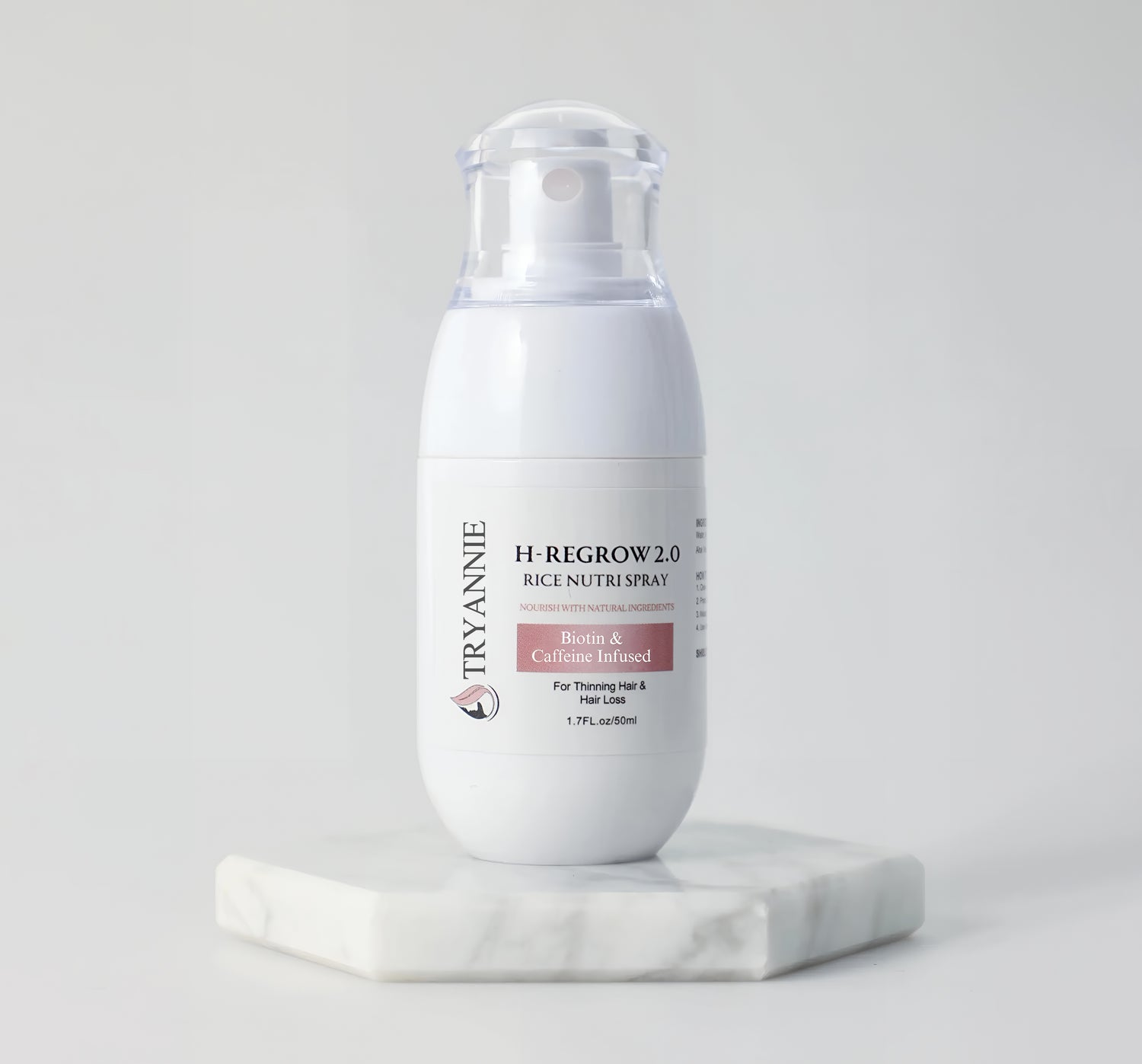 TryAnnie® H-Regrow 2.0 is a hair revitalization spray designed to promote hair follicle health, reduce thinning, and strengthen hair. It works by delivering a blend of plant-based ingredients, antioxidants, and amino acids directly to the scalp, nourishing and rejuvenating your hair for a fuller and healthier look.