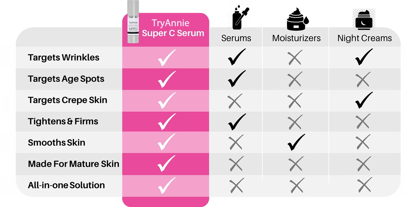 TryAnnie Super C Serum is an all-in-one moisturizing serum that contains safe & effective cosmeceutical grade active ingredients designed to give you long term results. It's formulated to reduce the appearance of wrinkles and age spots and leave your skin with a youthful glow.You can use it all over your face. It does a great job of replacing your eye cream.